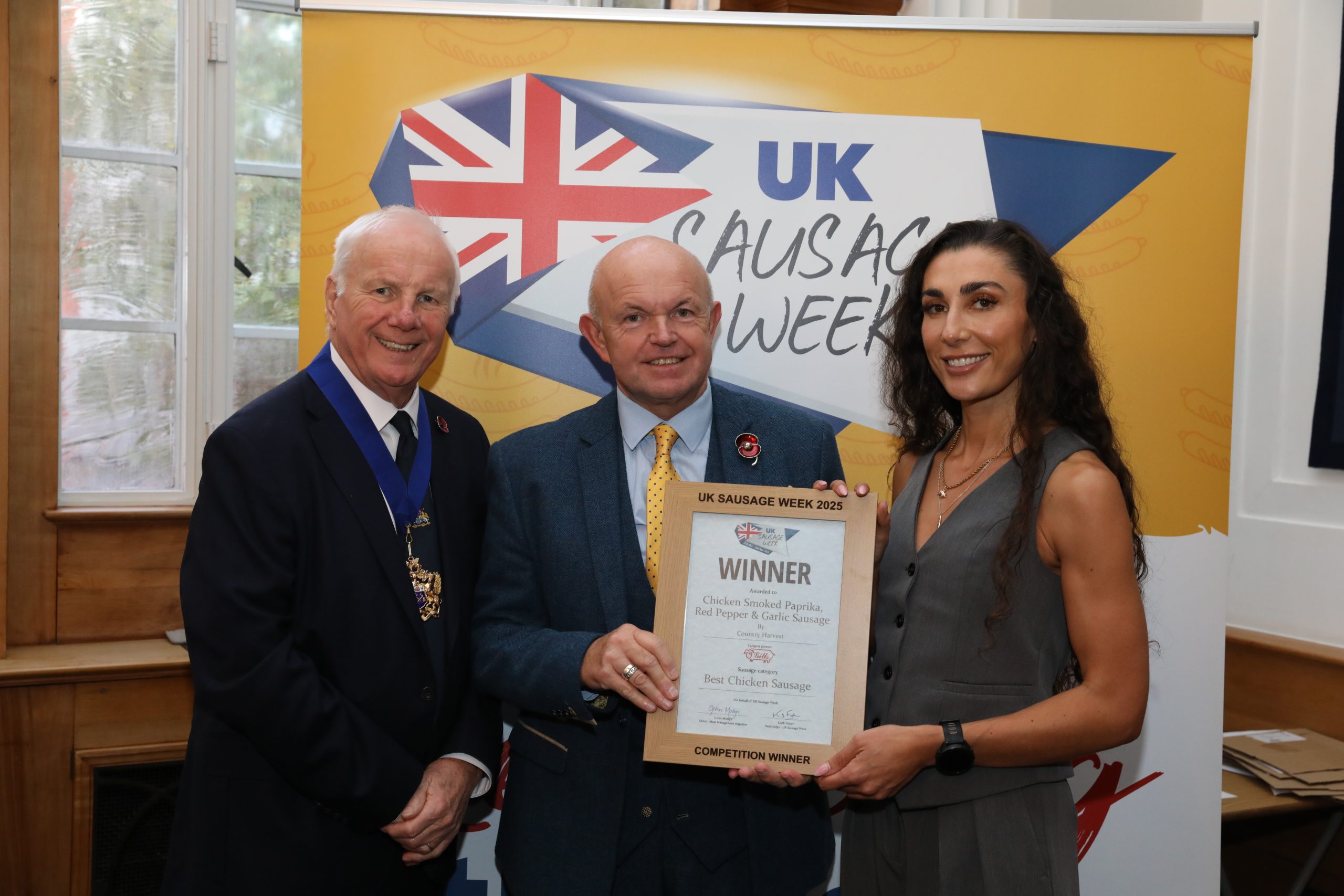 Best Chicken Sausage: Winner – Chicken Smoked Paprika, Red Pepper & Garlic Sausage – Country Harvest. (L-R) The Master, Billy Scott of Country Harvest and Robyn Khan of category partner Gills Meat Products.