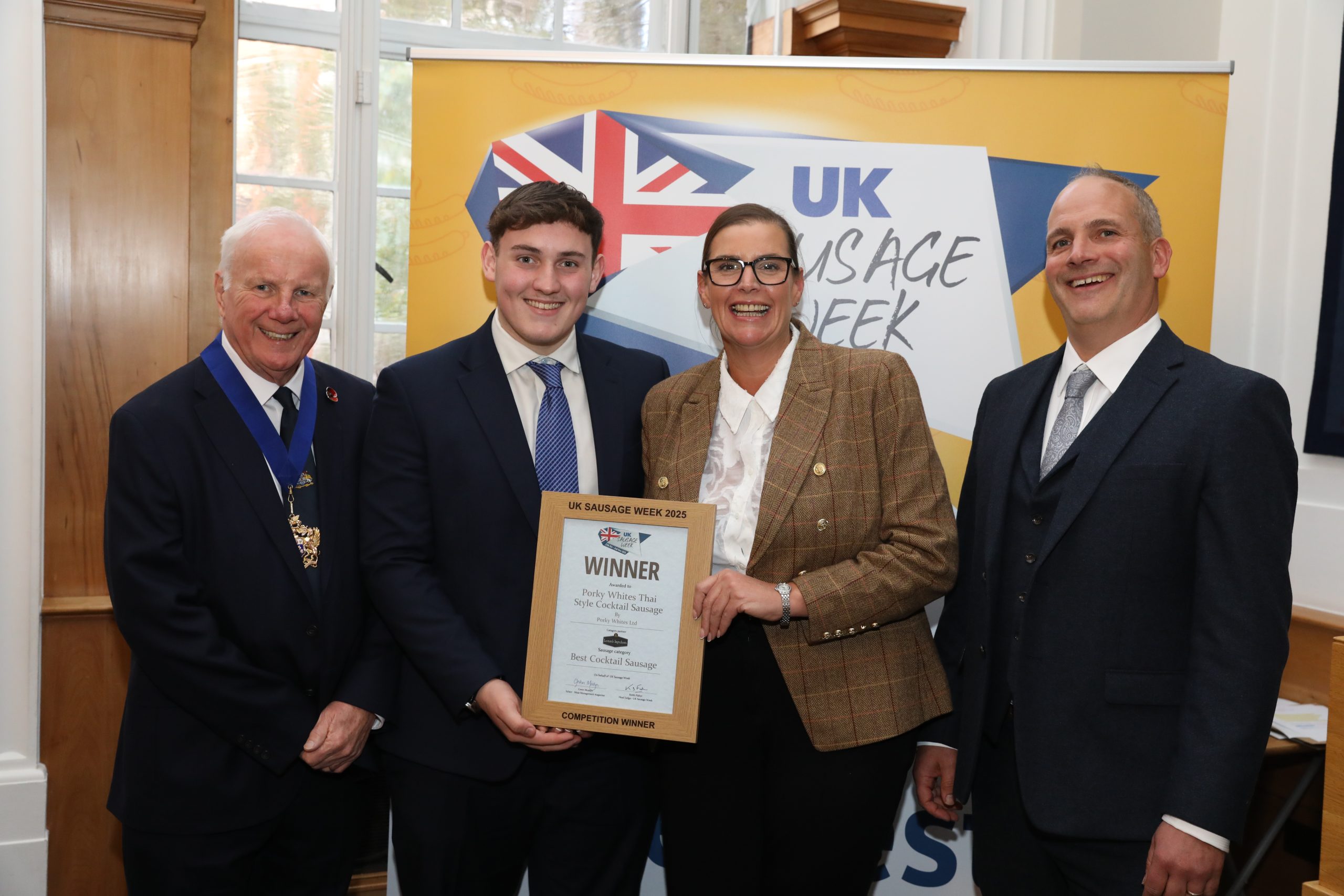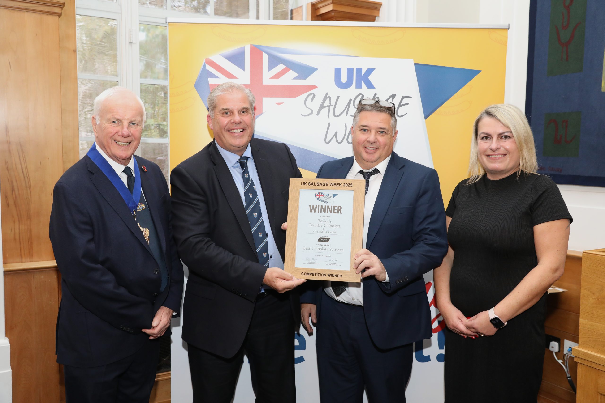 Best Chipolata Sausage: Winner – Taylor’s Country Chipolata – Owen Taylor & Sons Ltd. (L-R) The Master, Richard Taylor and Chris Gillott of Owen Taylor & Sons, and Aleksandra Ola Rybij of category partner Langford’s The Welsh Sausage Company.