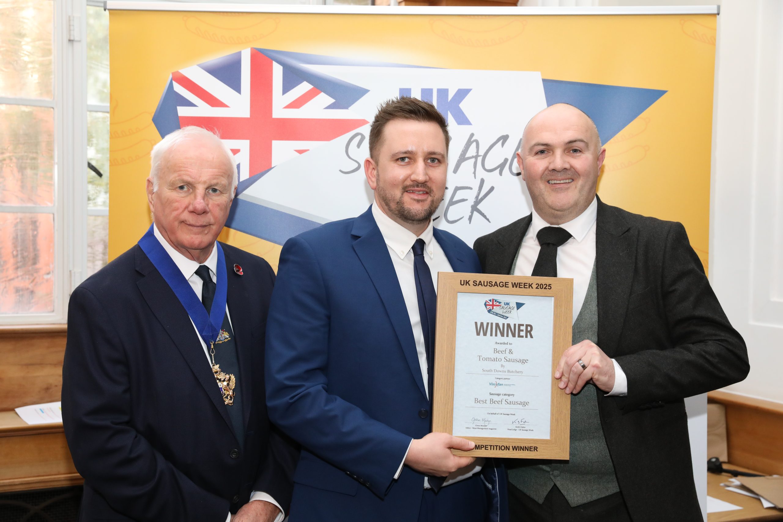Best Beef Sausage: Winner – Beef & Tomato Sausage – South Downs Butchery. (L-R) The Master, Matt Everest of South Downs Butchery and Andrew McCrudden of category partner Viscofan.