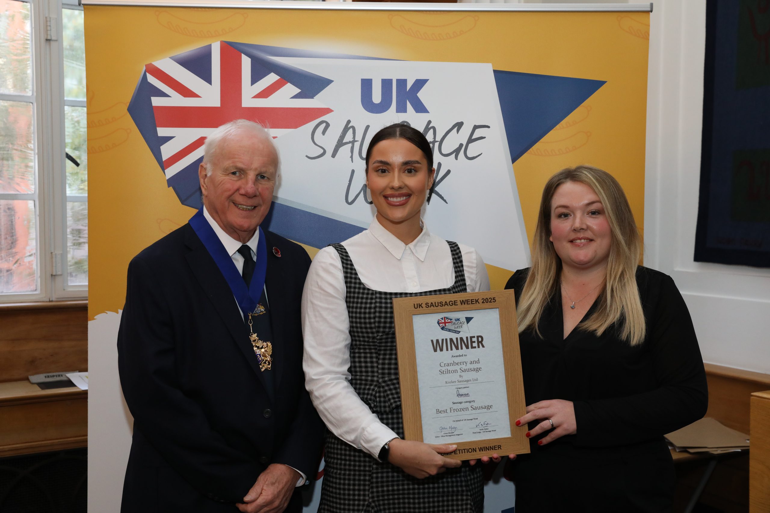 Best Frozen Sausage: Winner – Cranberry and Stilton Sausage – Korker Sausages Ltd. (L-R) The Master, India Hoad of Korker Sausages and Joanne Harpin of category partner Freeman Catering Butchers.
