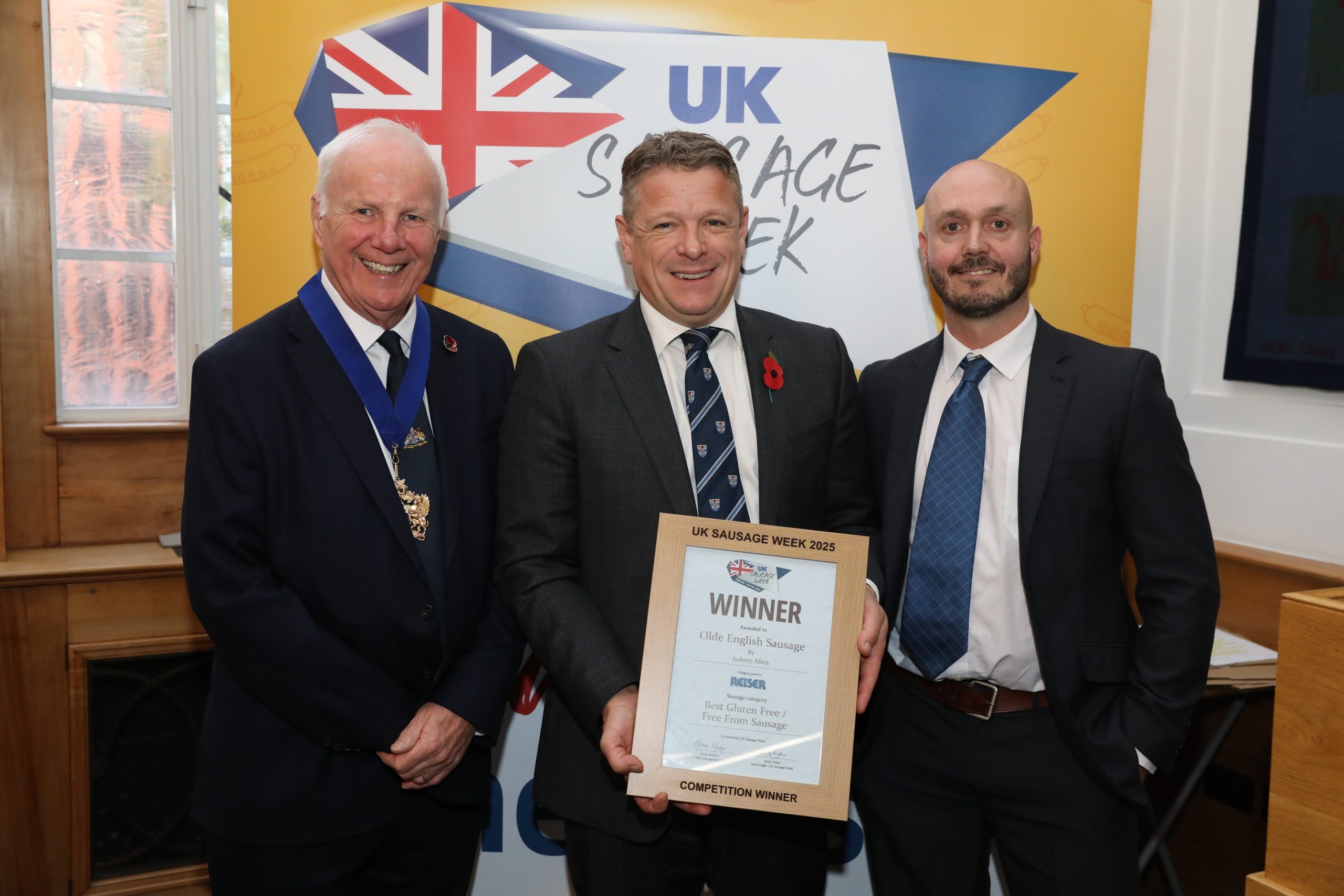 Best Gluten Free/Free From Sausage: Winner – Olde English Sausage – Aubrey Allen. (L-R) The Master, Russell Allen of Aubrey Allen and Michael Perry of category partner Reiser UK.